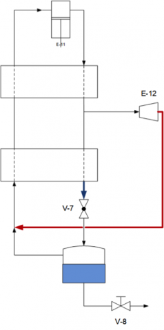 Gibb’s Law tells us that there is a direct relationship between pressure and temperature for a two-phase fluid of known composition. Hence by controlling the pressure at the top of the HP column we also control the condensing temperature of the HP nitrogen. Conversely, controlling the pressure at the sump of the LP column gives us control of the boiling temperature of the LOX bath. In summary, the temperature difference—and duty—at the condenser/reboiler is a function of the pressure ratio between the lower and upper columns.