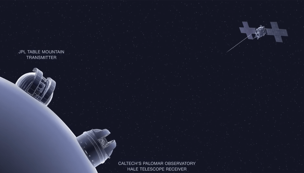 The 3-kilowatt laser beam starts at JPL’s Table Mountain Facility near Wrightwood, California, and travels as far as over 300 million miles – farther than the average distance between Earth and Mars – to the DSOC receiver that is mounted on the Psyche spacecraft. This laser beam helps Psyche properly aim its own communication laser back toward Earth. After being properly aligned, Psyche then sends a return signal back down to Earth, arriving at Caltech’s Palomar Observatory in San Diego County.
